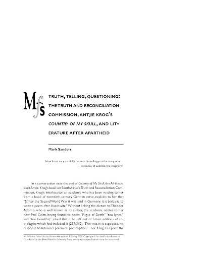 In a conversation near the end of Country of My Skull, the Afrikaans poet Antjie Krog's book on South Africa's Truth and Reconciliation Commission, Krog's interlocutor, an academic who has been reading to her from a book of twentieth-century German verse, explains to her that "[a]fter the Second World War it was said in Germany: it is barbaric to write a poem after Auschwitz." Without linking the dictum to Theodor Adorno, who is well known as its author, the academic relates to her how Paul Celan, having found his poem "Fugue of Death" "too lyrical" and "too beautiful," asked that it be left out of future editions of anthologies which had included it (237/312). This was, it is supposed, his response to Adorno's polemical proscription. 2 For Krog, as a poet, the [End Page 13] conversation provokes the question of whether it is not barbaric to write poems after apartheid: "That is why I say maybe writers in South Africa should shut up for a while. That one has no right to appropriate a story paid for with a lifetime of pain and destruction. Words come more easily for writers, perhaps. So let the domain rather belong to those who literally paid blood for every faltering word they utter before the Truth Commission" (237-38/312). Krog's interlocutor meets her proposition with the question: "Are you saying this because you yourself can't find a form for dealing with your past?" This, he tells her, was the failure of German writers after World War II. "No," she replies, "I often write pieces down from memory, and when I check the original tape it is always, but always much better than my own effort" (238/312). Their conversation traverses the terrain between an impulse to leave the domain of words and utterance to those who testified before the Truth Commission, and the possibility of finding form, as a writer, specifically as a poet, for a collective memory in which she herself is implicated. Then it departs in another direction. When the poet doubts her ability to lend form to the testimony she recalls, yet wishes to let the domain of telling belong to the witnesses, whose efforts always outdo hers, she must find a way, other than memorial reconstruction, of being host to their words. As formulated by Krog, the question of poetry, or literature, after apartheid concerns less an excess of lyricism or beauty, from which its creator stands back, than a writer's facilitation of the utterance of others. If the question of literature after apartheid is a question of advocacy, of its dynamics and its ethics, then the Commission shares a set of concerns and conditions of possibility with literary works. In interpreting its public hearings as occasions for advocacy, the Commission reveals that the structures of identification and substitution, on which it relies when it solicits the testimony of victims, are as integral to its own operations as they are to a literary work. Krog's book makes itself host to testimony in ways which allow us to understand how this is the case, and how even lyric poetry, in a sense ignored by the Adornian proscription, is able to display this joint partaking.